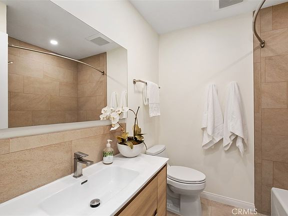 COMPLETELY REMODELED, 2 bedroom, 2 bath condo in a fantastic cul-de-sac location above San Clemente’s historic downtown! This home is ready for you to enjoy living in one of the BEST COASTAL CITIES in Southern California known for its friendly small-town vibe, surfing, golf, popular beach trail, wooden pier - and boasts some of the best weather in the world. The OPEN KITCHEN is thoughtfully remodeled with quartz countertops, undercabinet lighting, soft close drawers, large pantry, lots of cabinets, concealed trash, stainless gas range, microwave, and refrigerator. The dining area is located next to the kitchen with a nice, large window, & a PEEK OCEAN VIEW. Kitchen, living room and dining area is LIGHT AND BRIGHT with skies facing the ocean which can be exceptionally beautiful at sunset. OPEN LIVING ROOM features warm WOOD FLOORS and a large dual paned sliding door leading to the balcony, which is a perfect place for BBQing and relaxing. Newly resurfaced wooden floors in the living room continue throughout the rest of the home. The bathrooms and closet doors are tastefully renovated with modern floating cabinets. Ceramic countertops in bathrooms have integrated sinks and stylish back splashes. NEW INTERIOR PAINT! Very clean. An enjoyable feature is the ceilings in the kitchen, dining area, living room & bedrooms have been SOUND PROOFED to help create a quieter living environment. An EXTRA LAYER OF DRYWALL was added on the 1 common wall to minimize sound. The owners have truly done everything to make this condo wonderful. All windows and slider were replaced w/ ENERGY EFFICIENT DUAL PANED WINDOWS. Space saving “Two-in-one” washer/ dryer is conveniently located inside the home. This is the LARGER FLOOR PLAN in Brisas Del Mar. ONE CAR GARAGE with LOTS OF STORAGE AND SURF RACKS has a remote-controlled garage door opener. And unlike many condos in San Clemente, 214 Via Robina has PLENTY OF PUBLIC STREET PARKING for you and your guests. Community has lush landscaping. Roof was recently replaced, and buildings were fumigated. LOW TAXES AND NO MELLO ROOS! HOA pays for water & trash. Close to downtown, boutique shopping, San Clemente Outlets, great restaurants, the beach, pier and beach trail. Be sure to view the 3D walkthrough to see all this condo has to offer or better yet, see it before it is sold.