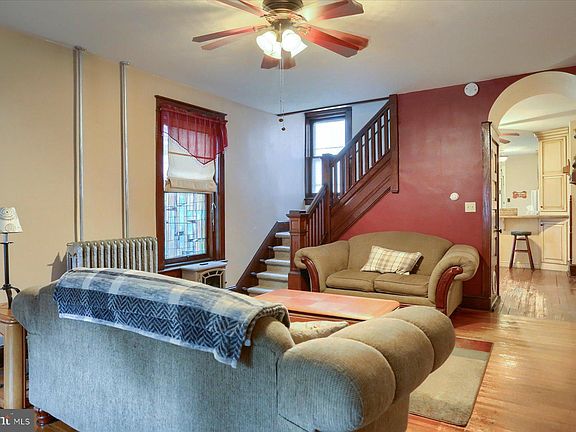 Brick end of row town home. Stained glass elliptical window overlooking the covered porch and a double entry front door invite you into this home. Large, inviting living room with hardwood floor and decorated plaster ceiling. Kitchen remodeled and ready to entertain. 3 bedrooms, all having hall access. 3rd floor has 2 rooms, partially finished (could be extra bedrooms, office, great study or play area). Back yard is fenced in. On street parking in front. Previous owner rented a parking space in the back. 1 parking space rented for $25.00 per month, paid for through the end of December. The 3rd floor has two rooms w/mini split allows that space to be used as bedrooms, office or playroom. thereby increasing the bedroom count to five. The mini split on the 3rd floor has both heat and air conditioning. This home has a lot of space and a super convenient location. Current owner rents one parking space for $25.00 per month, currently paid until the end of December.