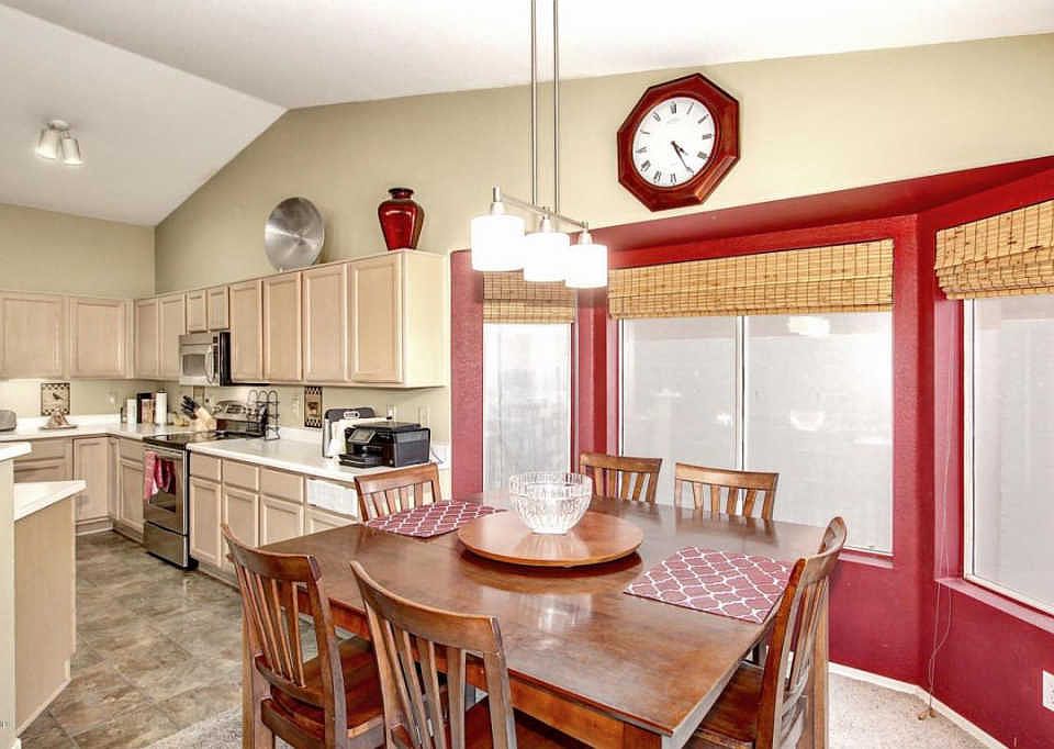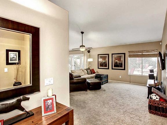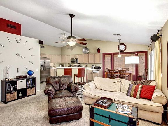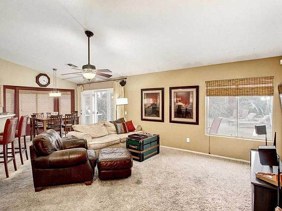 Fantastic single level Home with warm & welcoming palette, soaring ceilings, plush carpet, ceiling fans, upgraded lighting, plant shelves, and beautiful tile floor in all the right places. This great room floor plan offers patio access from dining area, breakfast bar, center island, SS appliances, and plenty of wood cabinets in kitchen. Laundry room with storage cabinets. Lots of personality in all bedrooms, 2 baths, and ample closets. Will NOT disappoint!
