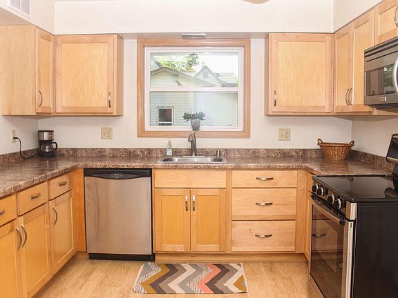 Charming home with low maintenance Lannon stone exterior, large yard, and attractive landscaping. Back patio is great for entertaining. Brand new carpet in Master BR and newer vinyl windows, kitchen cabinets and counters. Renovated bath with extra deep tub. Reverse osmosis system stays. Upgraded insulation keeps in the warmth on cold WI nights. Maple laminate in living room, dining room and kitchen. No basement, but home has a very large utility room with space saving on-demand water heater. Spacious 2.5 car garage provides additional storage. Plus, extra parking available next to the garage.