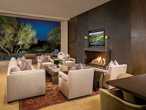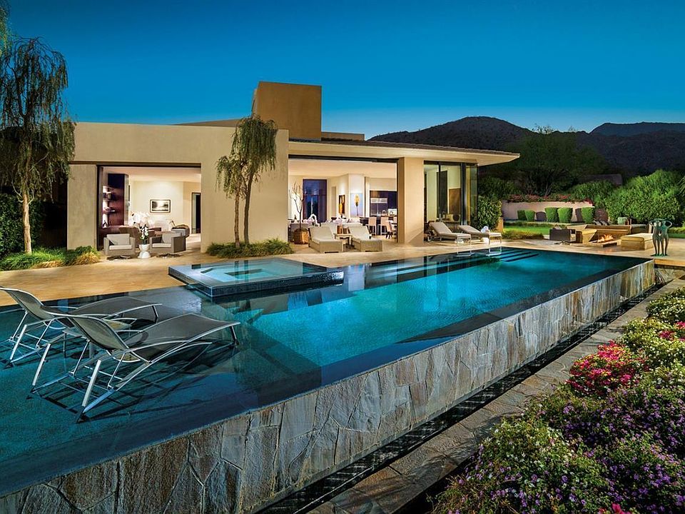 Clean contemporary remodel with floor to ceiling glass pocket sliders in great room and master bedroom. Infinity pool, over-sized lot with exceptional view of the 12th green, lake and mountain beyond.