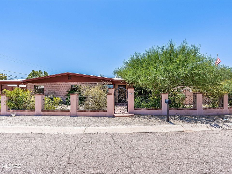 Come see the best in mid-century design! Exceptional care has been taken to maintain the original integrity. Careful siting on the angle of a large corner lot provides maximum privacy to the completely enclosed secret garden oasis. Custom wrought iron fencing surrounds the front to create an inviting courtyard. Relax under the gazebo or the shade of the back patio.. Raised garden bed by potting shed is fed by one of two cisterns. Single car garage or workshop has 220 voltage. Two sets of double gates are set up for recreational vehicles. Double pane energy efficient windows are custom engineered to retain the original steel casements. Room off carport is finished, cooled and ready for your studio or guest quarters. Roof was replaced in 2015. Blueprints for custom home built in 1960 are available.