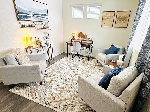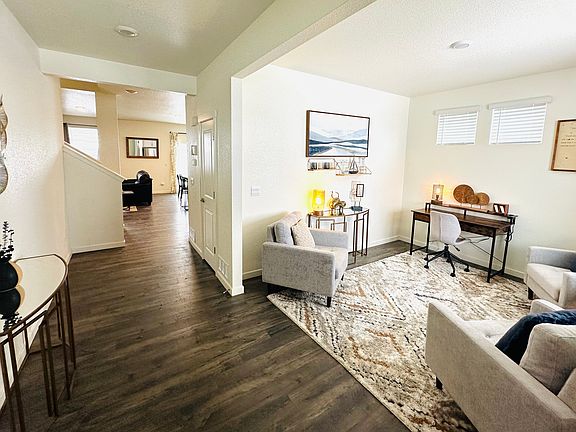 Fully Furnished. 30 day minimum rent. Available April 22nd thru May 28th only. Gorgeous New Home in 2022. 4 bedroom 3 full bath, 1 private office, corner lot. Primary has 5 piece bath and beautiful Mountain Views. Front sitting room with desk, full kitchen with 4 chairs at island, dining area with 6 chairs, living room w/gas fireplace, 1 queen bedroom and 1 full bath on main floor. Upstairs offers laundry room, primary queen bedroom with attached 5 piece bathroom, a loft area with ping pong table, 2 more bedrooms- 1 with queen bed and 1 with 2 twins, 1 full bath with private toilet and tub/shower area separated by door from 2 sinks and a private office with couch. Easy commute to Denver or Springs! Text for video tour link! Fully Furnished. All utilities included, including wifi, no cable.