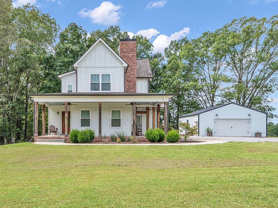 Welcome to this exceptional gem on 3.74 wooded acres! This fabulous rare find home offers 3 bedroom (primary bedroom on main level), 2 1/2 baths, granite countertops and tile backsplash in the kitchen, den/office with French sliding doors, separate dining room, living room with woodburning fireplace, laminated wood floors throughout, tile floors in bathrooms and laundry room, gorgeous view to the wooded backyard, spacious workshop garage. Enjoy a relaxing moment sitting on the front covered porch.