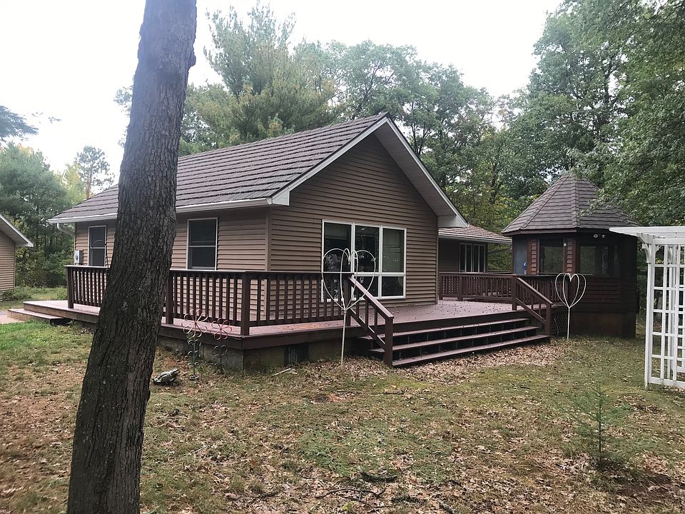 Very nice home in the sought after Webb Lake area, 2 hours from the Twin Cities. Just two steps up, with 2 bedrooms, 1 full bath with skylight, master bedroom with attached sunroom. A nicely wooded lot with a wetland wildlife viewing area to the east of property. Home has pine tongue and groove throughout interior and features all Andersen windows and patio doors. Steel shakes cover the roof for decades of reliability. Furnace and central air both new in 2011. Wrap around deck highlighted with a nice gazebo for enjoying the outdoors. Come take a look. You'll enjoy the area and solitude! 3 car garage plus 2 car garage all on almost 6 acres.