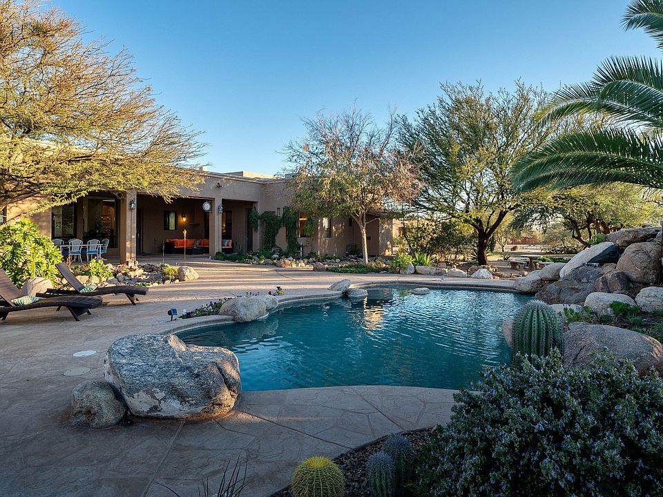 This dramatic hideaway, situated on over 4 acres, creates a strong spatial connection between the home and the surrounding landscape. Upon arrival, an air of grandeur pervades this incomparable Masonry built residence. Privately located and surrounded by sprawling mature desert landscape, adds to the feel of this sophisticated estate. Entering the residence, you are greeted by a large foyer with soaring ceilings, acting as the central hall, establishing the main connection point of the home, which opens onto the formal living and dining rooms. Complementing this perfectly executed floor plan, lofty ceilings and walls of windows opening onto the tranquil grounds at every turn.