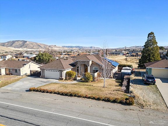 So much to offer! over 2000 sq ft, 4 bedrooms split wing design with one bedroom off entry with built in bookcases so great fo home office or cozy reading room. Formal entry, Formal dining area plus dining area off kitchen and breakfast bar, large open living room with fireplace and large windows bringing in so much light, great walk through kitchen with newer appliances & walk in pantry. 2 bedrooms on one side of home are great in size, hall bath has door to side yard & smart toilet upgrade. Master has door to back covered patio & amazing bathroom with jet tub sharing double sided fireplace with bedroom as well as nice stall shower & walk in closet with built in dresser. Home is equipt with owned solar, Tesla charger added in garage, storage shed, fruit trees, on over half an acre & location is so convenient close to freeway access and shopping. New floors installed in 2023, laundry room, 2 car attached garage