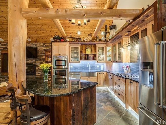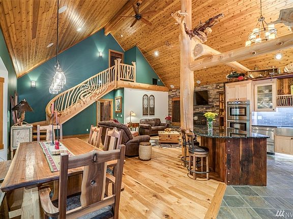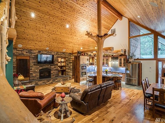 Must see this beautifully built home! As you can see when you view the photos, this home has many unique features, starting with the upside down tree when you walk in the front door. The tree and all of the associated log work, including the railing to the loft, were harvested off of a nearby forest and built by a local craftsman who is known for his quality workmanship.This home also offers a built in hot tub. You can shower off and soak in the hot tub without going outside in the elements.