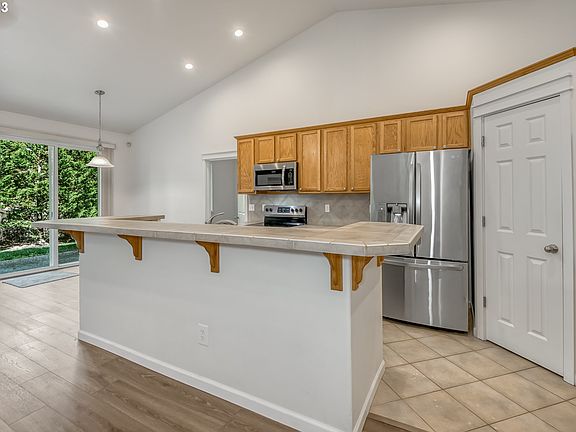 - Features: Dishwasher, Eat Bar, Island, Microwave, Pantry, Free Standing Range, Free Standing Refrigerator, Tile Floor, Vaulted Ceiling