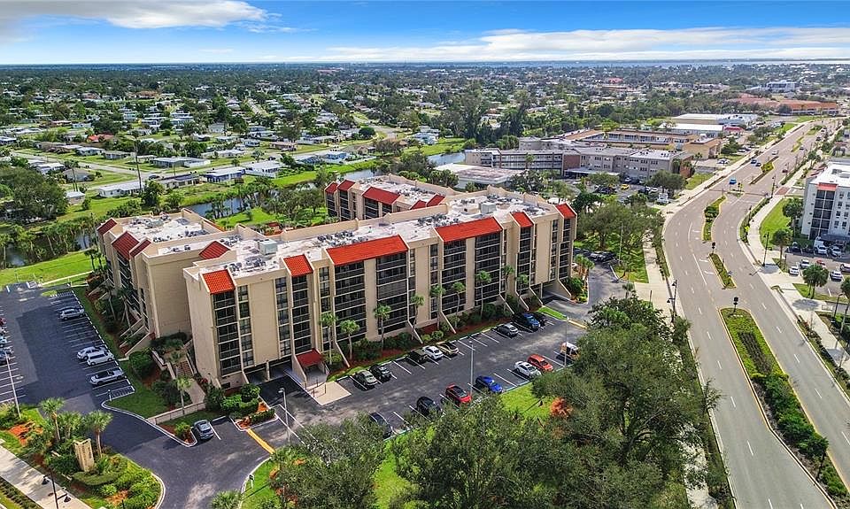 This UNBELIEVABLE opportunity in distinguished Promenades East just got better with a price improvement!!! Vintage condo with mid-century vibe is being sold completely furnished, has a gorgeous view of the pool/courtyard area, and new AC comes with conveyable warranty! The interior has been tastefully decorated with numerous upgrades including a portable cooking island, metal kitchen cabinets with stainless steel countertops provide durability and plenty of cooking space, new vinyl flooring in bathrooms comes w/15 yr. warranty, the commercial-grade carpet in both bedrooms is in great condition, and there are six-panel doors throughout! The vintage console in the living room is in good working order, the faux-leather couches have adjustable headrests, and the accent pieces provide plenty of storage!! The draw-leaf table in the dining area can accommodate your guests AND there are two-twin pallet beds stored in the master closet as well as beach towels and water accessories when family comes for a visit. Your assigned parking spot is out of the weather, near the elevator - your premier condo-plex is well managed, well maintained, and well protected with security cameras throughout as well as electronic exterior access! Did I mention the association? The Promenades East Condo Association has been awarded the Business Hall of Fame - Best of 2023 award, is a great place to call home, AND the association is not increasing condo fees for 2024! Enjoy the comfort of maintenance-free living with an onsite manager/maintenance personnel, a gorgeous heated pool, spacious spa, loads of fun activities and the added benefit of being conveniently located to anywhere you'd like to be! Charlotte Harbor is close by, beautiful Fisherman's Village with its quaint shops and water-front restaurants is just across the river, and the outstanding Allegiant Sunseeker Resort is open for business! Golfing, beaches, churches, and medical facilities are all within reach, and easy access to I-75 allows you to catch a flight from Punta Gorda Airport when you need a change of scenery! Not an age restricted community, no minimum years of ownership in order to lease, and there are no pending assessments! Your new condo is in short supply and won't last, make an appointment today!!