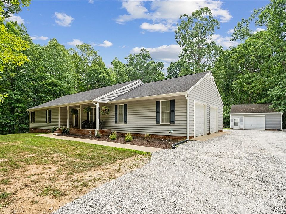 Welcome to 2141 Haskin Rd in lovely Goochland County, Va. This beautifully updated home, with high speed internet, is situated on an amazing 4.73 acre lot. The property is nicely shaped with each of the property corners located with orange ribbon. As you approach the home, you'll notice it's nicely positioned near the center of the parcel offering great privacy. The heart of every home is firmly set in the living and kitchen areas and this home surely sets the stage for many family gatherings full of memories. As you enter the vaulted living room you will see freshly updated surroundings along with a gas fireplace, hardwood floors, and plenty of natural light. Now turn your attention to the kitchen. The kitchen has been updated so nicely. It has so much to mention, brand new flooring, stainless appliances including gas cooking, amazing quartz tops, farmhouse sink, tile backsplash, and enough seating for 8 people at the two bar tops! The home then flows nicely into the sunroom, mud room, or dining area of the home. The dining area could easily be a 4th bedroom or home office space. Down the hall you have 2 bedrooms, both with their own unique features. The first having a double closet and custom built-in cabinetry while the other has a walk-in closet and direct bathroom access. The primary is strategically placed on the rear corner of the house giving it the most private setting within the home. The room is rounded out with a tasteful ceiling fan, new LVP flooring, walk-in closet, and an enormous private bath fully equipped with a large vanity, tiled flooring, and a jetted tub. Once you exit the home the fun doesn't stop. You have enough garage spaces to house 3 cars and plenty of room for the toys. The detached garage is insulated with built in work benches & shelving, along with new gutters, separate 200 amp service, and a gas line rough-in for future heat. The rear yard is nearly level great for yard games, swing sets, gardening & so much more. Come by and check out 2141 Haskin Rd, we hope you call it home!