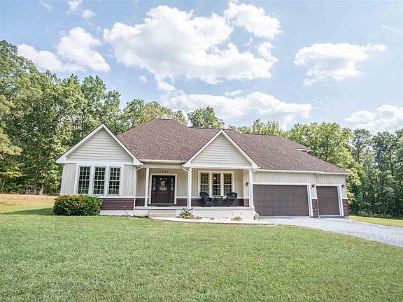 Contemporary ranch situated in Page County, VA. This home features over 2400 sq ft of living space on the main level with an additional 300 sq ft of unfinished space on the second floor. Features include a private office, a large open living room with cathedral ceilings and a gas fireplace, 3 bedrooms, 2.5 baths, a formal dining room, open kitchen with a breakfast area, laundry room, covered front and rear porches and garage spaces for 3 cars. Situated on 3.687 acres. The neighbor does have a septic easement on the front left corner of the property.