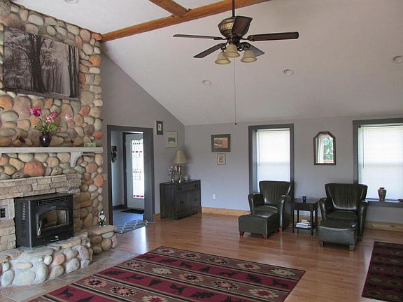 Newly remodeled 4 bedroom 3 bath on almost 5 acres on the Little Manistee. Large living area with floor to ceiling stone fireplace with wood pellet insert. Hardwood floors throughout, ceramic tile counters in the kitchen, trellised deck overlooking your own riverfront dock. There is also your own island in the river. Additional acreage next door also on the river.