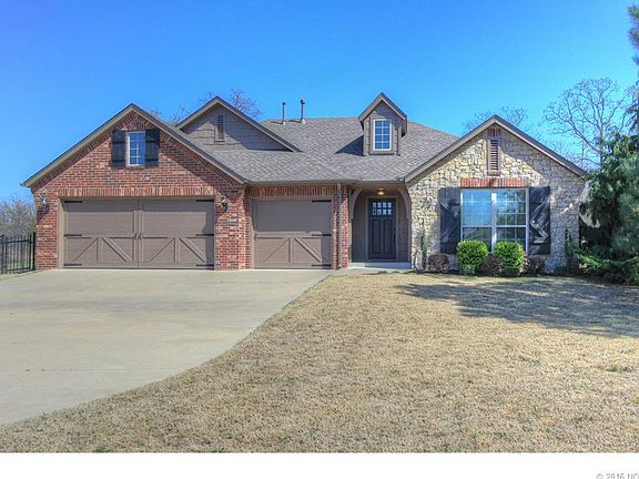 Newer construction w/great upgrades! Hardwoods entry/living! Stained concrete floors all other rooms! 3rd bay of garage insulated/heated & cooled! Open design, vaulted/beamed ceilings! Great Master! Roof/gutters 2016! 15 minutes to downtown Tulsa!