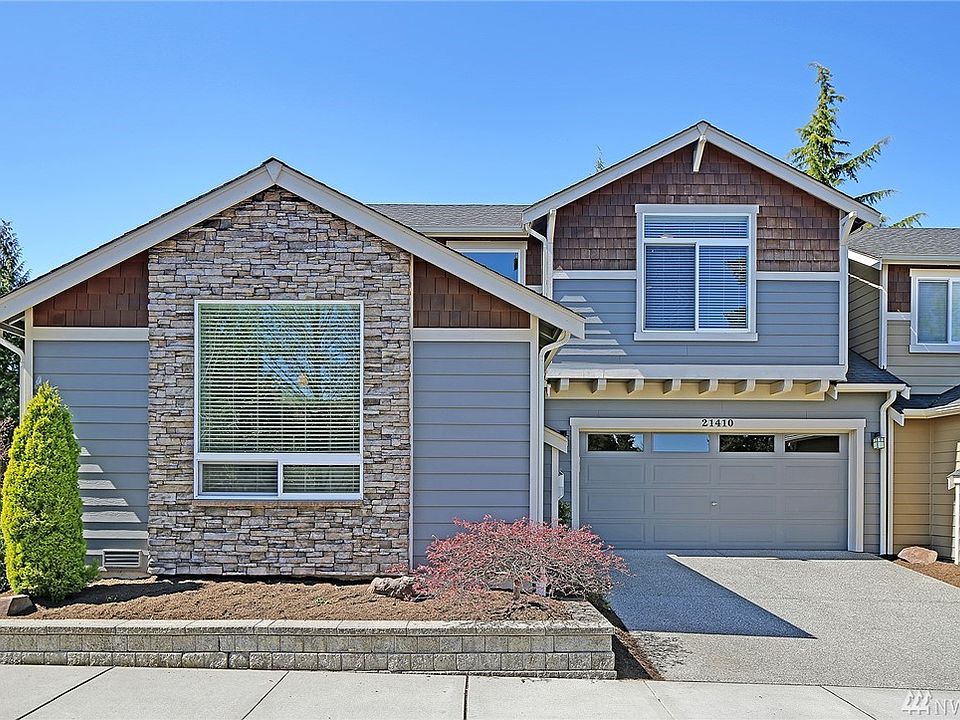 Welcome, to Aspen Lane, a quiet & welcoming small community of homes. Set on a corner lot, flooded w/ natural light from oversized windows, the main level boasts open concept floorplan and access to the backyard & two-car garage--highly desired floorplan of 3 bedrooms and 2 baths on the upper floor. Highlights include hardwood floors, new designer carpet, slab countertops, vaulted ceilings, gas fp, AC, Edmonds School District & convenience to both to Bellevue & Seattle. Light rail on the way!