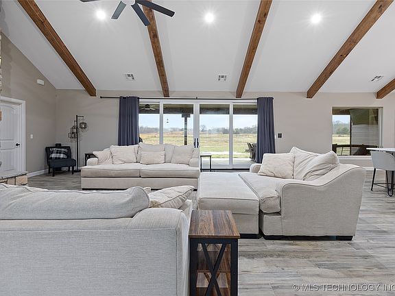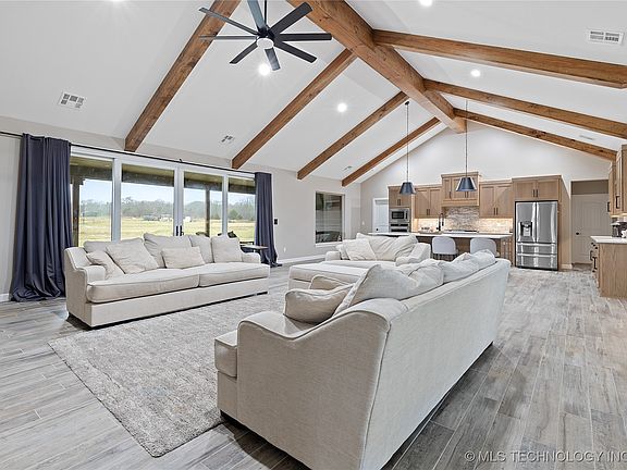 Welcome home to this stunning property located 30 min from Tulsa, 15 min to Sapulpa. BRAND NEW turnpike exit (just past the Kellyville exit) makes getting home smoother. You now get to skip town! As you walk up to the front door you will step onto wood grained stamped concrete that wraps around with the porch. The home features double sliding doors in the living room to capture the beauty of property. The living room features 14ft ceiling, wood beam accents, and impeccable stone fireplace. You can also enjoy looking from your luxurious master bedroom with vaulted ceilings, wood beams accents. The master bedroom has its own private master bath with 9ft walk-in shower and double shower heads. The kitchen boasts its 10ft island with granite countertops also in bathrooms, large walk-in pantry, mudroom, & laundry room. Both guests bedrooms have their own walk in closets and bathroom access.