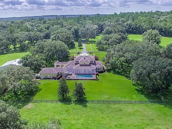 RARE LEGACY PROPERTY for the high-end buyer with discerning taste!! You must stand on the balcony and look out over your land - incredible view and feeling!! Enter through the private gated entrance which leads you down the paved winding road opening up to this impressive two-story traditional Plantation-style home with double porch/balcony adorned by tall grand columns and lined with french doors. The grand entrance draws your eye to the sweeping curved staircase centered between two matching parlor rooms with their own fireplaces - features of a true Plantation-style home. High ceilings through the home on each floor, real wood floors, tray ceilings with lighting, crown molding, chair rails - it has it all including the spacious and private outdoor living space! This stunning home has almost 5,700 sq ft of custom, luxurious living space and sits graciously centered on 30 acres (MOL) of gorgeous pastures with enormous live-oak trees. The property is secluded and feels completely private. The home offers 5 bedrooms (can be 6) + large office + media room + 5.5 bathrooms (includes guest suite with ensuite bathroom on a separate wing of the home) + formal living room with its own fireplace (parlor room with pool table currently) + formal dining room with its own fireplace (parlor room) + large family room with its own fireplace. The family room has large french doors that open to the beautiful outdoor living space with an outdoor kitchen and private pool. Attached 3 car garage is oversized (37x26) along with a covered portico attached near the kitchen for easy, dry access bringing in supplies to the private side entrance. Gourmet chef's dream kitchen was completely remodeled with all the bells and whistles, complete with built-in ovens, microwave, upgraded real wood custom cabinets, granite countertops, and a center island with wood butcher block countertops and additional cabinets for storage, full-sized wine refrigerator and hidden walk-in pantry. Full-sized separate butler/bar pantry. The kitchen has a breakfast bar and is open to the breakfast nook and media desk area. The master bedroom is on the first level and has large french doors that open to the pool area and private backyard.  The ensuite master bathroom has a center-piece garden tub, walk-in shower, dual granite vanities and sinks, two walk-in closets with built-in custom cabinetry.  Two staircases lead to the upstairs where there are three bedrooms each with their own attached bathrooms - all updated and upgraded with beautiful cabinets and granite. Also upstairs is the media room, which can be used as a 4th bedroom upstairs (making the home a 6 bedroom home) as it has its own closet and access to a full bathroom. Also downstairs is the guest bedroom with ensuite bathroom separated from the main home with a glass windowed corridor and access to the pool area. Never lose power with your built-in generator. Large detached pole barn for storage (48x42).  It has been home to two of Hernando County's notable families. Located near Historic downtown Brooksville with its courthouse and quaint shops and cafes. Only a 40-45 minute drive to Tampa for work or play. Lots of loving memories have been made here. It's ready to welcome its new family! Make those family memories together! Call for a complete list of features and a private showing.