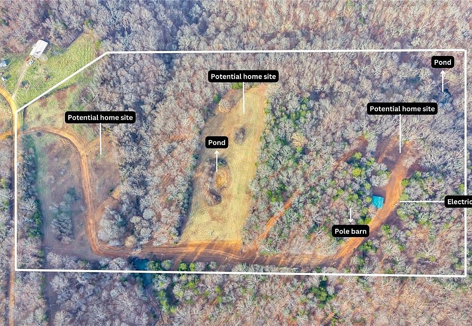 Ozark 22-acres is ready for hunting, ATV/four-wheeling trails already cleared, or building your custom cabin in the woods; with three building site opportunities. A 2025 survey has been completed, and recent major dirt work and clearing make the property truly build-ready. Features include two ponds (with mallard ducks sighted), fencing and cross-fencing, pens suitable for small farm animals, and a pole barn in great condition. Electricity has been run to the top of the hill, fiber appears to be available partway up the drive, and rural water is available at Pierson. Enjoy privacy, wildlife, and the natural beauty of the Ozarks—all that’s left to do is choose your floor plans and start building. No cell service but Starlink and Ozarks Go both show availability online; buyer to confirm. If you're wanting more land or to have friends join you an additional 8 acres across the road is for sale see MLS 1331474 or 21408 Pierson Rd.
