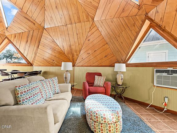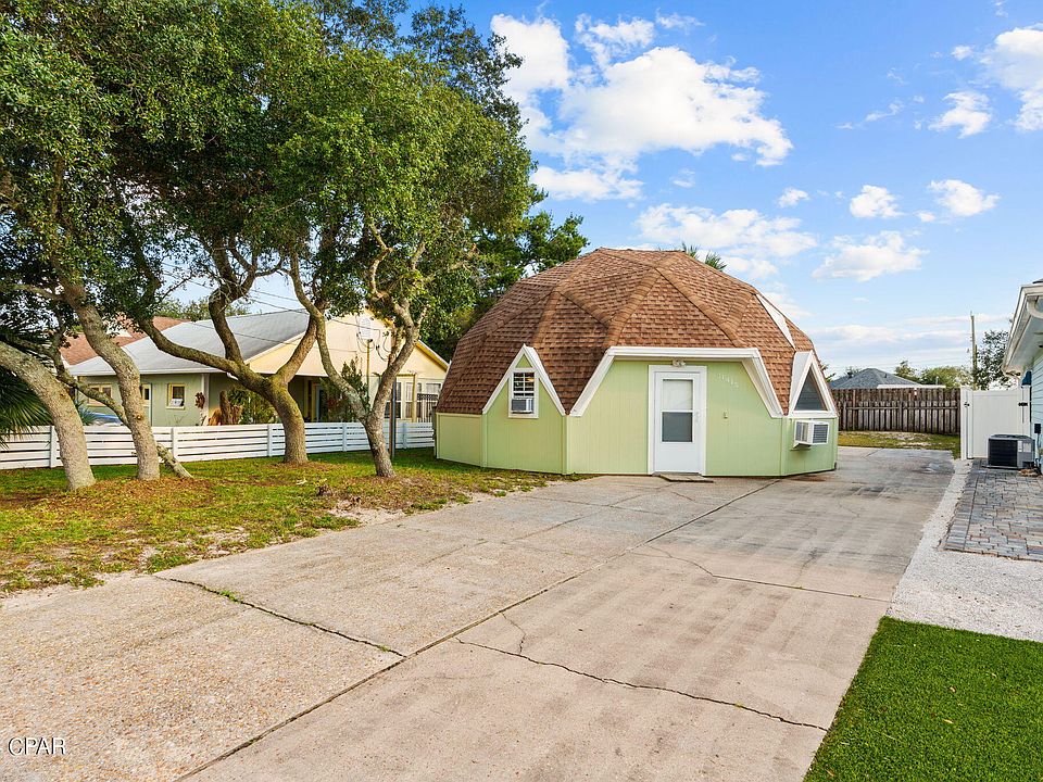 Unique dome house with stunning ceilings and spacious loft! Welcome to this one-of-a-kind dome house nestled just 4 blocks from the beach, where charm meets innovation! Step inside to discover a home boasting character at every turn, highlighted by its unique dome-shaped ceilings that create a spacious and airy atmosphere throughout. The main level features a cozy living room, two comfortable bedrooms, 1.5 bathrooms, and a generous kitchen and dining area perfect for gatherings. Upstairs, a grand loft overlooks the living space below, offering 1 queen size bed and 3 twin size beds, ideal for large groups or family vacations. Imagine the delight of your guests as they enjoy the novelty of staying in a dome house, a sure hit for short-term rentals. Whether relaxing in the expansive loft or preparing meals in the well-appointed kitchen, this home offers an unforgettable experience. There's even room for a pool on the property or room for expansion. Located in a neighborhood that's golf cart friendly and free of HOA restrictions, this property is less than 5 minutes from both 30A and Pier Park, ensuring easy access to shopping, dining, and entertainment. Don't miss out on the opportunity to own or invest in this truly exceptional dome house!