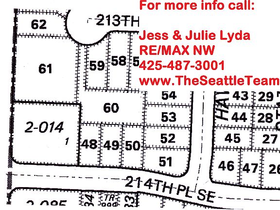 Located on the corner of 214th SE. & 35th Ave SE this .51 Acre corner lot has great potential for maximum lot yield. The lot dimensions are 160 x 140 - 22,347 sq. ft. The property backs to existing new construction plats with 5,000 to 7200 sq ft lots. Existing 4 bedroom home could be used as a rental during the short plat development process. Great level lot and location. All utilities are on the property. For more info: Jess & Julie Lyda RE/MAX NW 425-487-3001 www.TheSeattleTeam.com