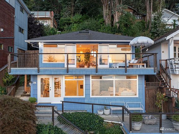 This phenomenal Alki Beach House is truly a thing of beauty. Sophisticated & designed to perfection. Nestled into the hills of N Admiral & overlooking Puget Sound and the Olympics, the panoramic views from this home will take your breath away. Watch for bald eagles soaring above or ferries cruising below. Enjoy this scene from the 300 sf deck, lower patio or any corner of the house. Featuring an open floor plan, brand new kitchen, oversized storage on the lower level & skylights throughout. Detached garage & plenty of off-street parking. The back patio provides a private, professionally-landscaped oasis. Located on a quiet street, just a 5 min stroll to the beach & nearby cafes. A quick trip across by water taxi or bridge to Seattle.