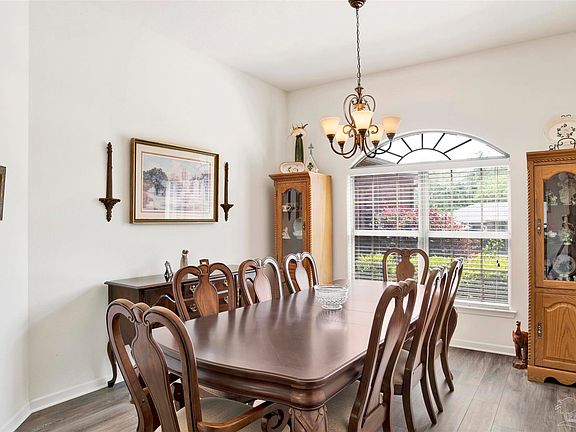 Welcome to this beautifully maintained 4-bedroom, 2-bath home that offers comfort, style, and incredible curb appeal! Situated on a manicured lot with mature landscaping and a lush green lawn, this home is move-in ready and full of charm. Step inside to find luxury vinyl plank and tile flooring throughout—no carpet here! The spacious great room features cathedral ceilings and a sliding glass door that leads to the expansive Florida room, tiled and wrapped in windows for year-round enjoyment and perfect views of the private backyard. Enjoy elegant meals in the formal dining room, highlighted by a stunning arched window that adds character and natural light. The kitchen is a cook’s delight with a center island, Quartz countertops, plenty of cabinetry, and stylish black appliances. It opens to a cozy breakfast nook surrounded by windows—perfect for morning coffee. The split bedroom floor plan offers ideal privacy. The primary suite is spacious and inviting, featuring a large bedroom, an ensuite bath with double vanities, a garden tub, a separate walk-in shower, walk-in closet, and a private water closet. Three additional bedrooms each include ceiling fans and ample closet space, while the second full bath includes a convenient tub/shower combo. The laundry room is smartly placed and leads to a double car garage, adding to the home’s functionality. Step out back to your private fenced yard, complete with an open patio, shade trees, and a powered yard building—perfect for storage, a workshop, or hobby space. This home truly has it all—space, style, and a welcoming atmosphere. Don’t miss your chance to make it yours!