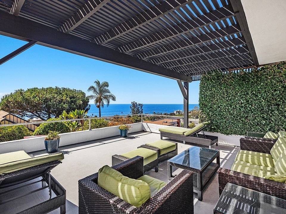 The residence showcases distinctive Streamline Moderne design with curved stucco walls, porthole windows, and nautical-inspired details offering both charm and a sense of history. Inside, the open layout is designed for comfort and connection, whether you're enjoying a quiet morning or hosting sunset gatherings. The spacious front deck frames endless ocean vistas, while the terraced backyard creates a private escape surrounded by mature fruit trees.