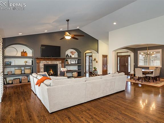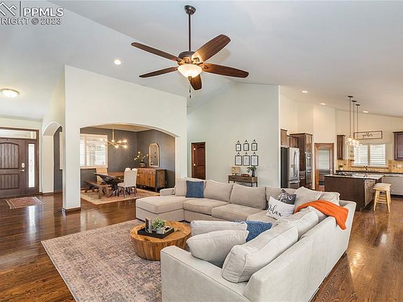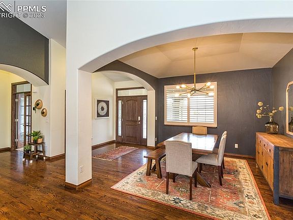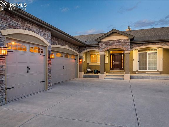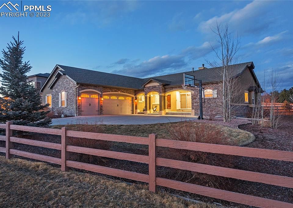 6 BED/4.5 BATH/6 CAR GARAGE in FLYING HORSE! Welcome to this sprawling, fully fenced, custom ranch home nestled in northern Colorado Springs’ premier, resort-like golf course community - complete with optional membership opportunities to the private 18 hole golf course, pools, tennis courts and more. Step into over 5200 sq ft of living, working, and play space located at the end of a quiet cul-de-sac, with easy access to I25, and within walking distance to Academy-20 schools. High ceilings and expansive, open common areas make gatherings easy on both levels of this beautifully maintained home. Work from home in the main level office with french doors, access to the front porch and beautiful view of Pikes Peak. Enjoy Colorado evenings out on the large, fully covered concrete patio, complete with gas line ready for your grill. Plantation shutters adorn the main level Living Room, Kitchen, Dining Room and Primary Bedroom. A spacious Master Suite, complete with sitting area, an oversized spa shower, and large walk in closet is on the main level with 2 secondary bedrooms (one with a loft area) that share a private, en suite, Jack & Jill bathroom. The well-appointed kitchen opens up to the high ceilings of the living and dining areas. The lower level’s kitchenette, complete with a full-size refrigerator, full sink w/disposal, microwave, and eating bar, can serve the gatherings there, or serve as a separate living area, if you need it to. 2 of the 3 additional bedrooms on the lower level have en suite access to their own bathrooms. New garage doors (2022) open up to the fully tandem, high-ceiling, enormous garage, with enough space for 6 cars, providing ample room for your workshop and/or larger toys. You'll also find a climate-controlled bonus room off the garage that opens to private, fully fenced-in pet area. Smart features, Bluetooth sound systems, and A/V equipment are in place in this beautiful home and ready to enhance your experience- whatever you need that to be!