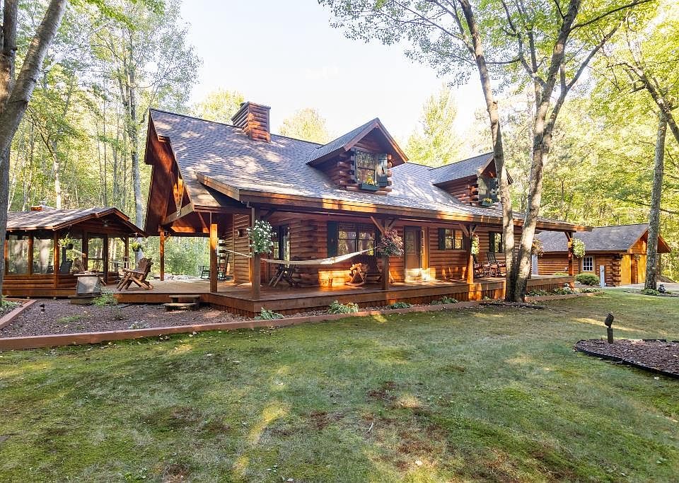 Custom home built Log sided home built by the builder for their personal dream home for maximum privacy and for the natural lover in all of us! Built in 2000 and exceptionally kept one owner estate nestled on 16.88 acres. You can view the beautiful woods from every window. The log is 2 sided inside and out with 2 x 6 stick built construction with full R21 insultation inside for maximum energy efficiency. Details include Kitchen with island, Pantry, custom cutting boards, cabinets offer some with glass, open concept to the dining room and great room. Great Room offers 2 story custom fireplace and hardwood floors. Windows with views of the woods through huge, covered decks and wildlife everywhere. Owners? suite has direct access to the main level bath and it?s own patio. All closets in the home are lit. Additional bedroom on the main level. Open staircase (wood locally sourced and step book matched) to a loft leading to the upper level with views of the vaulted ceiling and lower-level centered fireplace. Upper level 15 x14 bedroom and additional full bath. Tons of storage and dormer