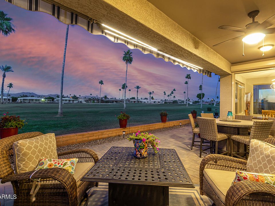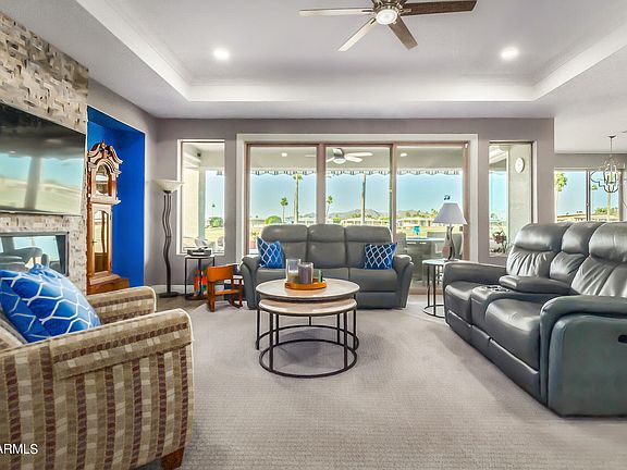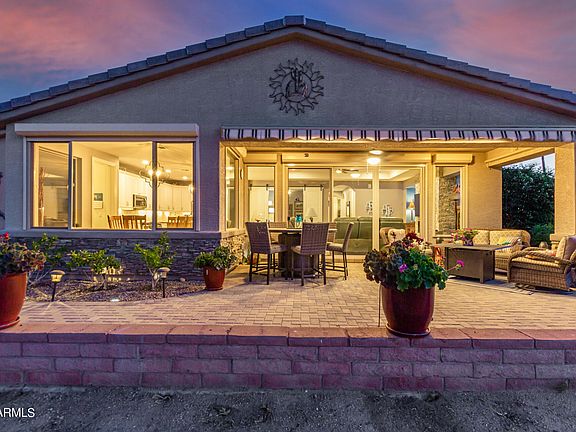 The WAIT is OVER! New build in 2019 on prem GOLF COURSE LOT with PANORAMIC MTN VIEWS.This 2 bed + Den has been lovingly taken care of & has all the modern features you would expect in a new home. 1 level, all porcelain tile flooring, open concept kitchen & fam rm; Kitchen has large island w/granite counters, SS appl; Den could easily be set up with a bed for those extra guests. Electric fireplace in the fam room for those cool winter evenings. 2 beautiful patio areas out back to look out on the golf course and catch the ever changing colors of the evening sunset dancing off the surrounding mtns. Lg master bth w/ curb-less shower; Garage is oversized & pristine w/ custom cabinets, epoxied floor, including a sep golf cart stall. Security shutters for easy lock & leave protection. Won't last