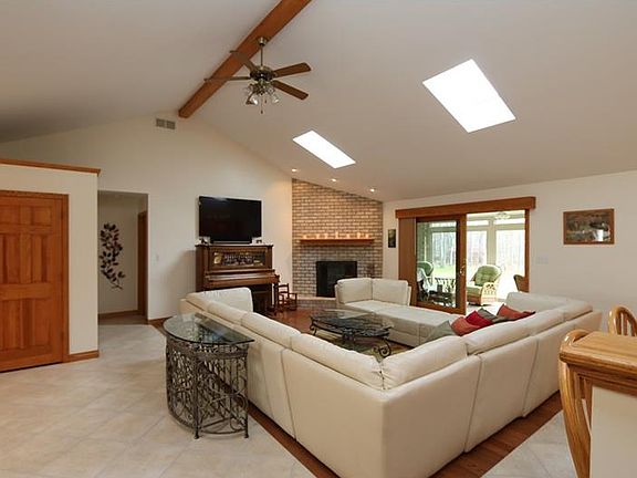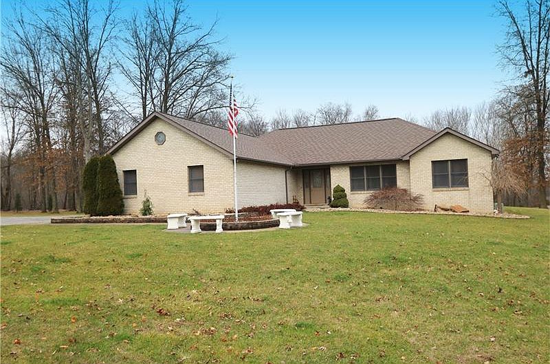 Entertainment at its finest, brick ranch with vaulted great room with 3 skylights! , custom oak kitchen, 12 x 36 all season room, 11' hand crafted raised panel oak bar in basement with train overhead, garage doubles as a small banquet hall with sink, 25' cabinets, counter top and frig. 22 x 28 barn with 2nd floor wood shop, lots of privacy and parking. 7.552 level acres!
