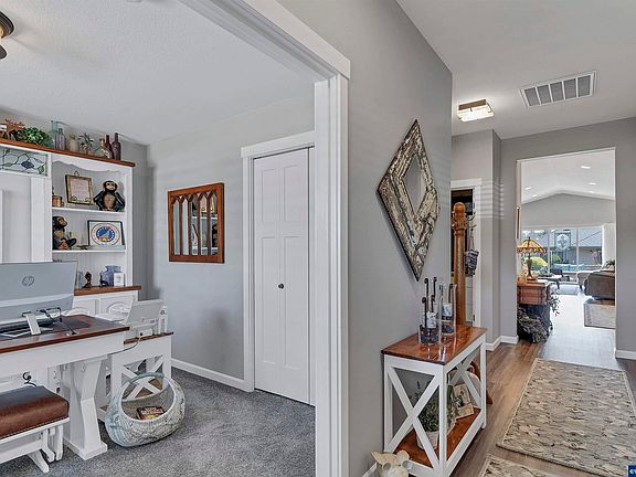 Located in the 55+ community of Eden Gleann, this 2-year-old home features 3 bedrooms, 2 full bathrooms, and numerous upgrades. Highlights include solar panels, plantation shutters, stainless steel appliances, and a master suite with an en-suite bathroom. The landscaped backyard boasts a serene water feature, ideal for relaxation. The property also features a dream garage with ample space for hobbies and storage. Enjoy a comfortable, active lifestyle with this low maintenance home.