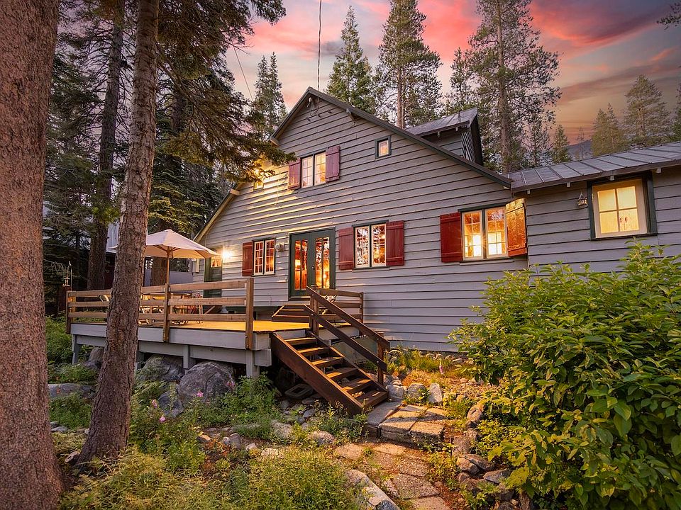 Classic 1930s Tahoe-style cabin near Donner Summit, nestled on nearly 5 acres of a private mountain estate adorned with impressive granite boulders. This property offers easy access to world-class ski resorts (both downhill and cross-country), rock climbing, hiking trails to lakes, and cycling. The house is a perfectly preserved timepiece that encapsulates an era of mountain living, featuring an all-wood finish inside and out, with knotty pine walls and ceilings, and fir floors. The centerpiece of the great room is a large granite wood-burning fireplace framed by built-in bookcases. The dining area features a built-in bench suited for a large table, ideal for family and friend gatherings. The kitchen, conveniently located next to the dining area, provides a delightful environment for meal preparation. An adjacent room hosts a pantry and laundry room. Upstairs, the original 12-bunk bedroom has been transformed into a main suite with a clawfoot tub and a built-in armoire. There are two separate en-suite bathrooms and an adjoining small private office with internet access. The east wing comprises two bedrooms: the "Boulder Bedroom" overlooking a granite boulder and the "Sunny Bedroom" with windows facing east, south, and west. At the end of the closet-lined hallway is a shared bathroom. The west wing includes two additional rooms, one featuring high ceilings and its own wood-burning stove, and the other a smaller room with a closet and en-suite bathroom. This wing can serve as additional guest bedrooms, living space, or a semi-separate unit. The house has three sources of heat: a 1,000-gallon propane tank that fuels a wall furnace and kitchen range, electric wall heaters in almost every room, and storage for three cords of wood, ideal for winter months. The exterior is newly painted, and the house boasts a durable metal roof. A welcoming deck overlooks wildflowers among aspen, evergreens, and granite walkways. There is also a Petanque court in the backyard and ample parking for five to six cars in various driveways. On the upper lot, a seasonal stream flows from the northern to the western corner, where an older concrete tennis court can also be found. This cabin, unchanged hands in the past 50 years, has been cherished by only two other families since its construction in the 1930s. This is a once-in-a-lifetime opportunity to own an authentic large mountain home. The sale of this property also includes the adjacent vacant parcel at 21420 Castle Drive, with both parcels totaling 4.96 acres.