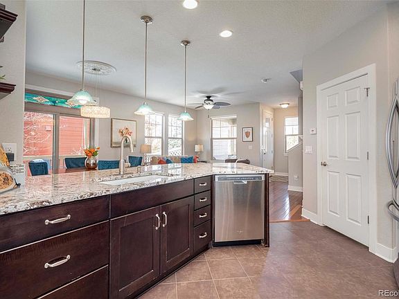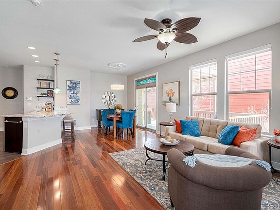 Welcome to this beautiful home! This charming property boasts a 2.5 car attached garage and Brazilian teak flooring throughout. The newer exterior paint (only 3 years old) gives the home a fresh look and the HOA covers snow removal, front lawn maintenance, irrigation, alley, and trash/recycling services. The Gemstone permanent exterior holiday lighting is a standout feature, controlled by an easy-to-use app. With ample natural lighting, the open-concept floor plan and beautiful living spaces provide a warm and welcoming atmosphere. Step inside and fall in love with the upgraded features all around, including stainless-steel appliances, high-end cabinets, granite countertops, and an eat-in peninsula in the kitchen. Both the primary en suite bath and the full hall bath upstairs boast gorgeous dual-sink vanities and custom tile accents. This home offers a perfect blend of style and practicality, perfect for both relaxing and entertaining. Come see it for yourself, and you'll see why it's the perfect place to call home! Community amenities include a pool and clubhouse, and nearby Tallman Meadow Park and Discovery Park.
