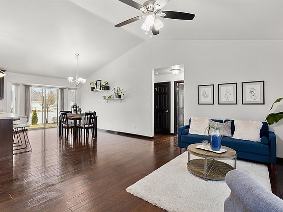 Like new, but better! This 3 BR, 2 BA ranch w/ finished 3 car garage is sure to please! Step inside to be welcomed by engineered hardwood floor throughout. Vaulted ceiling and open split BR floor plan. Kitchen with SS appliances and island. Dining area overlooks the patio into a spacious backyard. Primary bath r with large WIC and full bath featuring double vanity and walk-in shower. Laundry room, 2 additional BRs and full BA complete the main. Head downstairs to find an unfinished basement ALREADY framed for future BR, full BA and family room. This one won't last long, comes pre-inspected! Offers presented 4/8 at 12 pm.