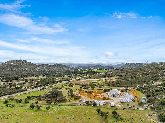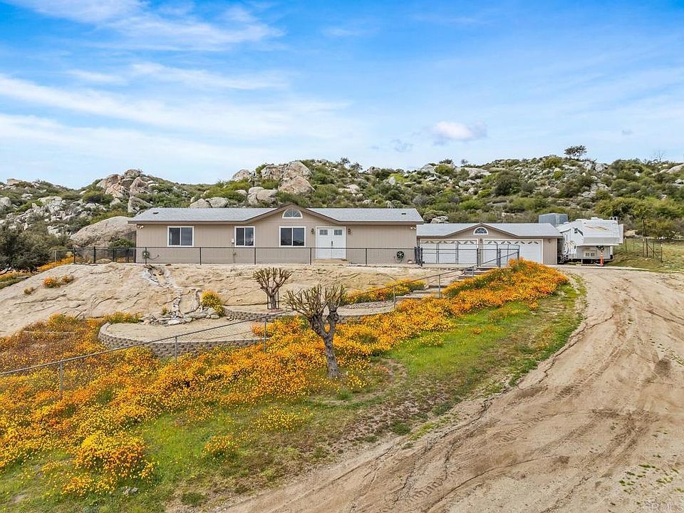 Lovely 3BD 2BA Manufactured home on permanent foundation on 7.2 lush acres. Completely fenced and crossed fenced with a 4 car garage. Garage has full bath to easily convert to ADU, if desired. RV hook-ups and incredible down valley views to the Northeast. Property is gently sloped with a bubbling decorative waterfall tumbling down just below the front patio. Wander down under the shady mature scrub oaks to the paddocks and arena installed specifically for your 4-legged friends. House is move-in ready with easy to maintain travertine flooring throughout. Rooftop solar keeps your energy bills low and your summers cool. Concrete patios all around provide outdoor entertaining areas. Just a short drive to Lake Morena County park offers fishing, hiking and riding trails. Everything you need to enjoy living in the country. You'll never want to go to town again!