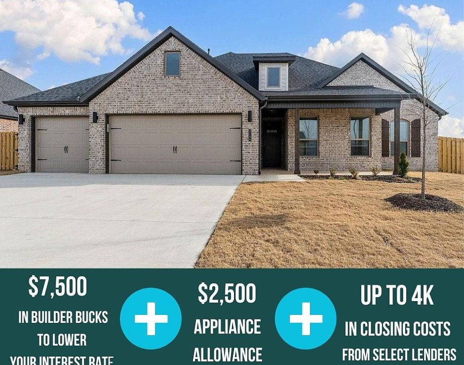Introducing the 2,282 plan this split layout features 4 bedrooms and 2.5 bathrooms. The primary suite is privately situated on one side of the home and offers a seamless flow from the bedroom to the bathroom, into the walk-in closet, and directly into the utility room. On the opposite side, three additional bedrooms share a full bath. At the center of the home, a vaulted living room opens to the kitchen and dining area. The living room showcases an electric fireplace, while the kitchen features beautiful quartz countertops throughout and a charming breakfast nook for casual dining. A convenient half bath is located just off the kitchen. Enjoy relaxing evenings on your covered front and back porches, with the backyard enclosed by a privacy fence. Plus a 3-car garage. For a limited time, Lower your interest rate with $7,500 from the builder + $2,500 appliance allowance + up to 4k in closing costs from select lenders. For a total of up to 14K with lender incentives. Fence, blinds, and gutters are all included.