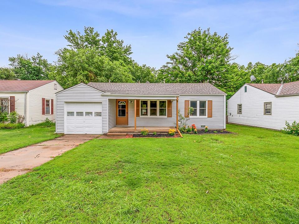 This darling gem of a house is a 2 bedroom, 1 bath updated home on a quiet street in SE Wichita. The covered front patio overlooking a peaceful ravine and tall tree line will be your favorite spot during cool weather. Inside you will find original hardwood floors throughout the living room, hallway, and both bedrooms. The large closet in the living room along with built-ins in the hallway gives you plenty of good storage space. The newer windows are insulated for energy efficiency. The updated kitchen comes with all the appliances, including the washer and dryer in the attached laundry room. The backyard is fully fenced and includes a storage shed to keep your one car garage tidy. Conveniently located in a neighborhood with limited access to reduce traffic yet close to great shopping and entertainment, along with the trendy updates make this a gem worth finding!
