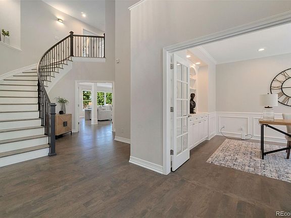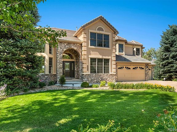 This home is 4,423 sq. ft + 2,148 finished basement. Perfectly situated on one of the largest lots in the Tanglewood section of SaddleRock offering mature landscaping and zoned sprinkler/ plant drip system. 5 bedrooms, 5 baths, plus a main floor office and upper bonus room both with french doors. The grand entrance foyer is adjacent to the formal dining room and living rooms. The large open floor plan with designer finishes make this a classic semi custom home hard to duplicate. Located in a cul-de-sac with guest parking, has privacy & backs to a greenbelt overlooking the 18th hole on Saddle Rock Golf Course. This home features new hardwood flooring, beautiful built in book cases and artist coves throughout. The gourmet kitchen boast slab granite countertops, stainless appliances, double ovens, a gas cooktop, and under cabinet lighting with white glass faced cabinetry plus plenty of storage. The signature kitchen opens to the great room, nook and large upper deck for your indoor outdoor living. Enjoy picture windows with western facing rooms and unobstructed golf course and rockies views is priceless. Each bedroom has walk in closets, primary suite w/vaulted ceiling with 5 piece bath, multi jetted rain shower, radiant heated tile floors showcasing custom inlay glass tiles with accents. The finished walkout basement is filled with natural lighting and a wet bar with beverage refrigerator. The basement has its own ensuite bedroom and bathroom with open space to be customized for your lifestyle. The additional flex room is ideal for any hobby including a home gym. The long driveway & 3 car garage with epoxy coated floor has additional guest parking spaces in front + SE facing drive way. This well sought after neighborhood in cherry creek school district is conveniently shopping, entertainment & dining.