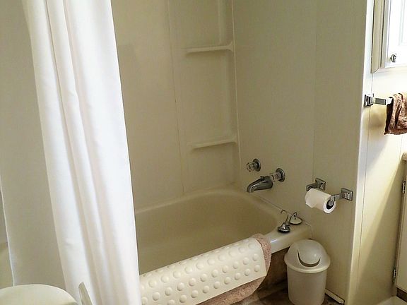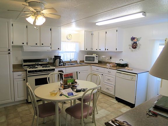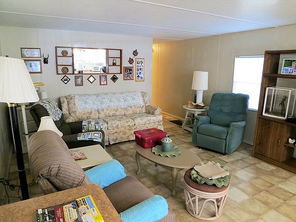 Vinyl windowed RAISED LANAI plus additional SCREENED ROOM!! Fully furnished clean 2 bedroom/1 bath single wide with step in tub/shower. Home features kitchen updates including countertops, sink/faucet, bottom cabinets as well as coveted gas range and a portable dishwasher. Newer vinyl flooring installed throughout entire home perfect for Florida sand with easy maintenance. Carport has been reinforced and leads to workshop with bonus sink/vanity. Lots of possibilities with this one! **This home is not located in the pet section