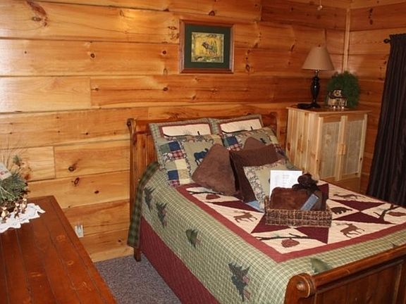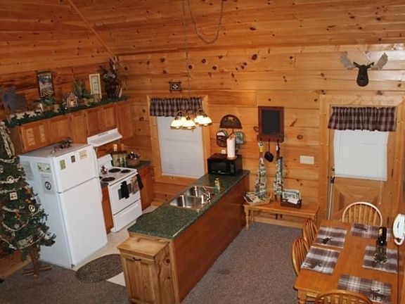Authentic log cabin, most secluded in resort plus a nice view!. RENTAL READY or 2nd vacation home! Features 3 bedrooms, 3 baths (2 BR; 2 baths on MAIN); open concept kitchen, dining, and family room with fireplace. Loft with game room has additional sleeping area, plus 3rd BR and bath. Laundry, owner's closet; wrap-around porch; hot tub; 2nd floor balcony; and crawl space storage complete the package. Conveys with all built-in kitchen appliances; lg cap HE washer/dryer; most of the furniture; pool table; and some decor. Resort has city water/sewer and county roads! (rare) Resort amenities include swimming pool, bathhouse, picnic pavilion, mowing of common areas; mgmt; onsight dumpsters, and more. Very reasonable annual HOA fee.