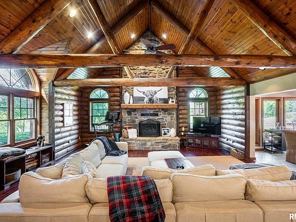 Rustic Luxury Log Cabin Retreat on 17 Acres Welcome to your private escape — a stunning 3-bedroom, 3.5-bath log home spanning over 4,500 sq. ft. and nestled in a one-of-a-kind wooded setting. This property perfectly blends rustic charm with modern comfort, offering the peace of country living just minutes from town. Step inside the grand entrance and be greeted by soaring cathedral ceilings, exposed wood beams, and a majestic stone fireplace that anchors the great room. Expansive windows fill the home with natural light and frame breathtaking views of the surrounding landscape. The chef’s dream kitchen features custom cabinetry, a matching pantry, and plenty of space for entertaining. The primary suite is a true retreat, boasting a luxurious walk-in shower and an impressive walk-in closet. The finished basement provides additional living space ideal for a game room, family area, or music studio, as the current owners have designed. There’s no shortage of storage, with ample closets, utility areas, and even a pole barn outside for additional space. Outdoors, enjoy two stocked ponds and an in-ground pool surrounded by cooling concrete. The pool house offers heat and air, a kitchenette, living area, and full bath — perfect for guests or entertaining. Additional highlights include a geothermal heating and cooling system with dual tanks for energy efficiency, and a roof heating system to prevent ice buildup during the winter months. These homeowners have thought of everything!