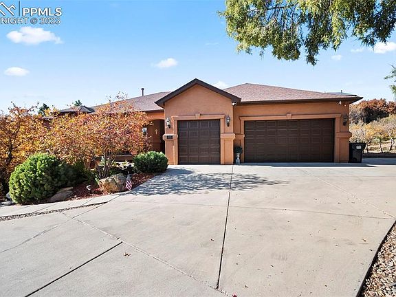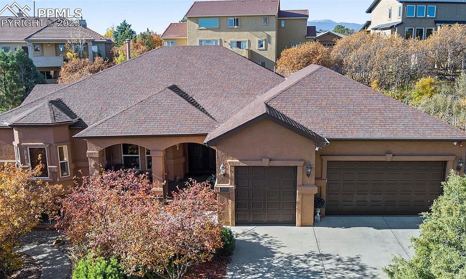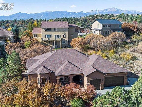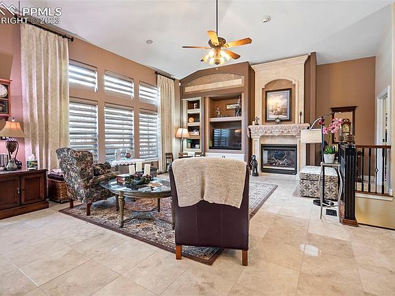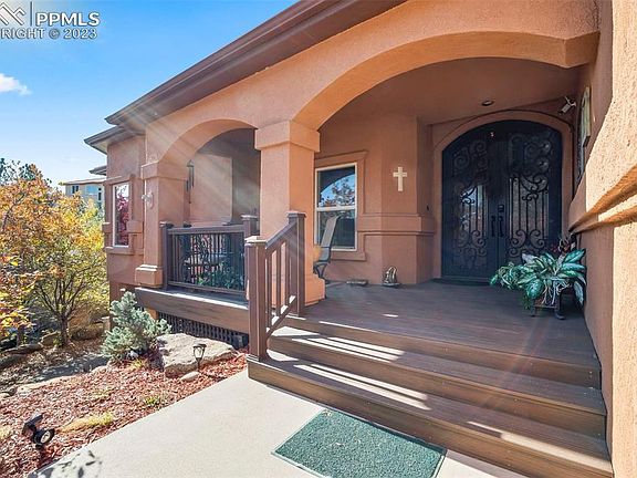 This 4 bed, 4 bath Rancher in the heart of University Park offers the epitome of elegance and comfort, boasting a perfect blend of modern convenience & timeless charm. The imported iron & glass double doors set the stage for the grandeur within. The travertine floors lead you through a home where every detail reflects old-world craftsmanship. The dining room, adorned with plantation shutters and imported solid stone pillars, exudes an air of refined elegance. The living room captivates with its floor-to-ceiling limestone double-sided fireplace, creating a warm ambiance that permeates the entire home. French doors and 9 ft+ ceilings amplify the sense of space and light. The inviting open eat-in kitchen features Cherry cabinets, double ovens, and a convenient walk-in pantry. The main level also features a private office and a secondary bedroom, making it a perfect blend of practicality and luxury. The main level primary bedroom is a sanctuary of serenity, complete with a bay window, a 5-piece bath boasting solid marble vessel sinks, a Hydrotherapy tub, and a custom marble shower. With an additional bedroom, full bath, and laundry room on this level, convenience is always at your fingertips. Venture downstairs to discover the epitome of hospitality - a custom wine room, a wet bar with a travertine farm sink, a spacious rec room, and a separate media room. Two more bedrooms and a full bath provide comfort and privacy. Entertain guests on the expansive composite deck, shaded by a Sunsetter awning, overlooking the low-maintenance grounds that perfectly capture the essence of CO living. The bubbling rock pond at the front porch and the private flag lot add to the unique charm. Amenities such as built-in speakers, A/C, dog run & 3-car garage with utility sink enhance the overall appeal. New Roof 3/24! Conveniently located to walking trails, parks, shopping centers, UCCS & CSCS. Immerse yourself in the exclusive University Park experience–where luxury meets Colorado charm.