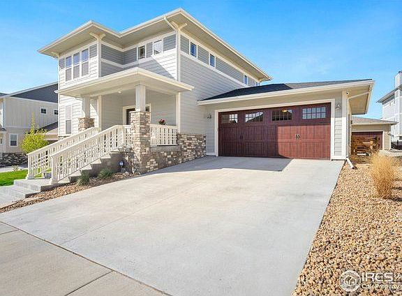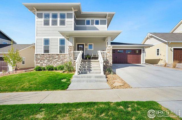 Looking to live the Fort Collins lifestyle of bikes and trails (take the Poudre Trail nearby to work!), brews, and mountains This modern farmhouse prairie-style home in the award-winning Bucking Horse neighborhood offers all the above and more. No need to remodel as this house was the 2020 Cremello model home by Bellisimo, and features a finished basement with screen and projector already set up for movie nights. Collect your milk delivery on the covered porch, and walk into your sparkling white kitchen with stainless steel appliances (featuring a swish microwave drawer oven!), and an island with quartz counters. Cozy up by the fireplace on a winter morning, or walk up to Jessup Farm Artisan Village for a cappuccino at Bindle. Floors on the main level are solid and stylish hickory wood and tile. The main floor bedroom can also be used an office (the house is already set up with fast city broadband) for the remote worker. Park your camper in the oversized garage and welcome home!