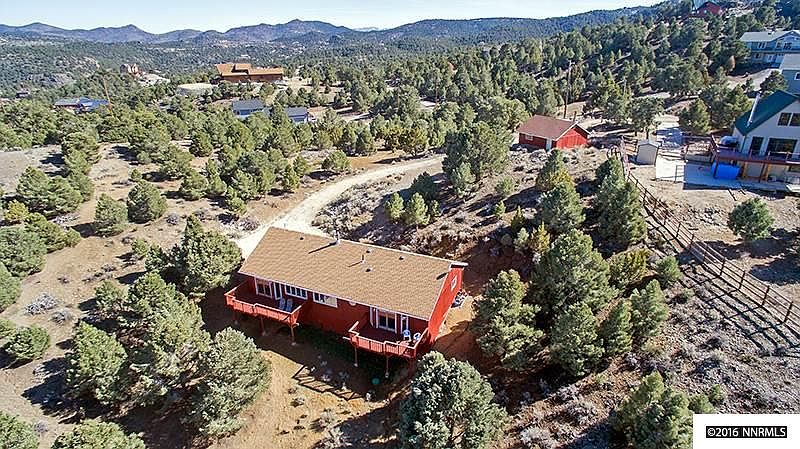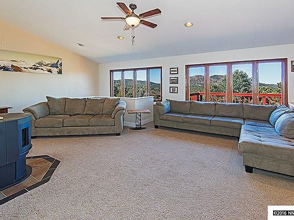 Majestic view, upgraded interior and privacy make this the perfect Virginia City Highlands home! Stargaze or sunbathe from two separate decks or listen to the sounds of the wild horses eating rye grass during the gentle Highland Summer. A granite slab entertainment bar perches above the family room which is ideal for entertaining. Large panel windows invite ample natural light and accentuates the large ceramic tile and oak flooring. Please be advised the driveway is steep and narrow. The master bedroom has mountain views through the panel windows and glass doors that lead to the private deck. There is also a walk-in closet and completely remodeled bathroom with floor-to-ceiling Travertine tile in the shower. Stay cozy with the efficient pellet stove that sits atop hand crafted tile. The kitchen boasts granite slab counters and backsplash, along with a breakfast bar. Every room on the main floor provides vaulted ceilings, recessed lighting and custom paint. The floor plan provides 3 bedrooms on the main floor, 2 bedrooms and one half bathroom on the bottom floor. All windows are UV treated, bedroom two also has a walk-in closet, bedroom 3 has double doors and is perfect as an office, and the laundry room is large.