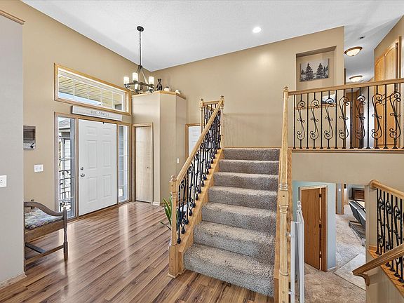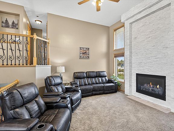 Stunning 4+ level home on 0.46 acre lot with 5 bedrooms and 3 full bathrooms located in Big Lake. This home features vaulted ceilings and large windows that fill the space with natural light and offer beautiful backyard pond views. The tile and laminate flooring, two stone-surround gas fireplaces, granite countertops give additional elegance. The master suite features a whirlpool tub and double vanity for a true retreat. Enjoy peaceful mornings or evenings on the covered deck or patio that's overlooking the pond. The walk-out basement provides easy access to the backyard and outdoor living spaces. Additional features include a 4-car garage, and a storage shed-all set on a large corner lot in a desirable neighborhood.