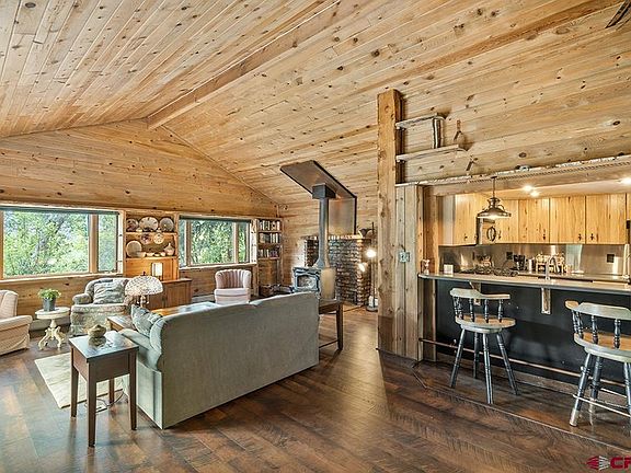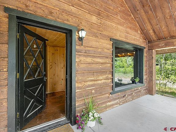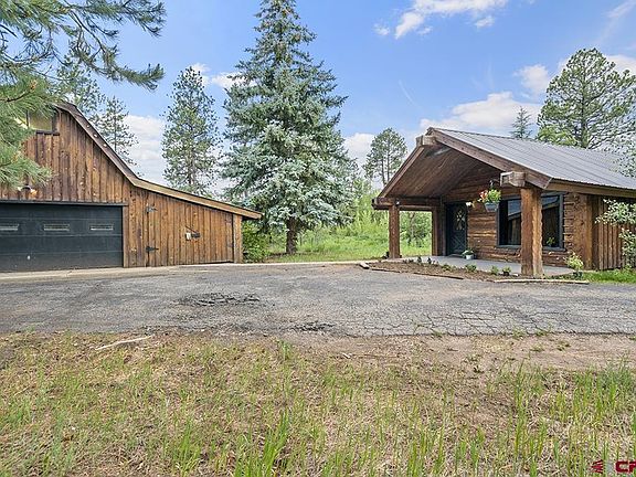 Beautiful country 3 bedroom 3 bath home with mountain charm and artistic touches throughout on 3.9 private wooded acres. With an easy 15minute drive to Durango via paved and maintained roads, this property is also only 10 minutes away from Lake Nighthorse, 2 miles from the Hesperus ski slope, and central to other towns in the 4 Corners. With no HOA or covenants, you are free to use the property as you wish. It would make a great horse property. Additionally, there is small unattached cabin with a loft that has potential for an Airbnb, a separate sturdy shed, and an outbuilding that could be converted into horse stables. Going into the home you enter a hallway with two hexagonal windows. The first bedroom suite to the right has a large bathroom with hand crafted cabinets and doors and copper touches. Moving farther inside you will come to the great room featuring a soaring vaulted ceiling and tongue and groove custom woodwork. An airtight wood stove backed with copper wallboard and copper accents provides steady heat. Built-in log shelving on three sides of the great room completes the ambiance of country charm. Sliding patio doors open onto a deck perfect for outdoor grilling and entertaining or just relaxing and enjoying the spectacular scenery of the La Plata Mountains. The open concept kitchen/living/dining is accentuated by an abundance of custom crafted cabinets, solid surface countertops, stainless steel appliances, and a breakfast bar with handcrafted stools. The large dining area highlights a unique fireplace accented by a copper stove pipe and hearth. Past the kitchen, a hallway leads to two large bedrooms. The master suite is by a stained glass window and has a spacious closet. A latched double glass door provides natural light, and abundant flora and leads outside to a private area. The master bath has a claw foot tub, a vintage pull to flush the toilet, and a large window providing ample light and forest views. The bedroom opposite the master suite has a high ceiling and three large windows that bring the beauty of the outside in. A full vintage 1950 era bathroom on the opposite side of this bedroom serves as the third bath. Down the hallway, there is a recessed area for the washer and dryer and on the other side is the furnace room with a new hot water heater. At the end of the hall is a large room with a hot tub. This room can be used for an office or an exercise room. Continuing back outside, a car enthusiast will love the huge barn-wood sided 609 sq ft detached garage with plenty of room for a workshop and all of your toys and large equipment. Above the garage, there is a loft that would be perfect for an exercise room, an art studio, or for extra storage. There is plenty of room for your RV in the oversized carport attached to the garage. The circular drive provides easy in and out. If you are looking for a special home replete with artistic touches, this home is a must see.
