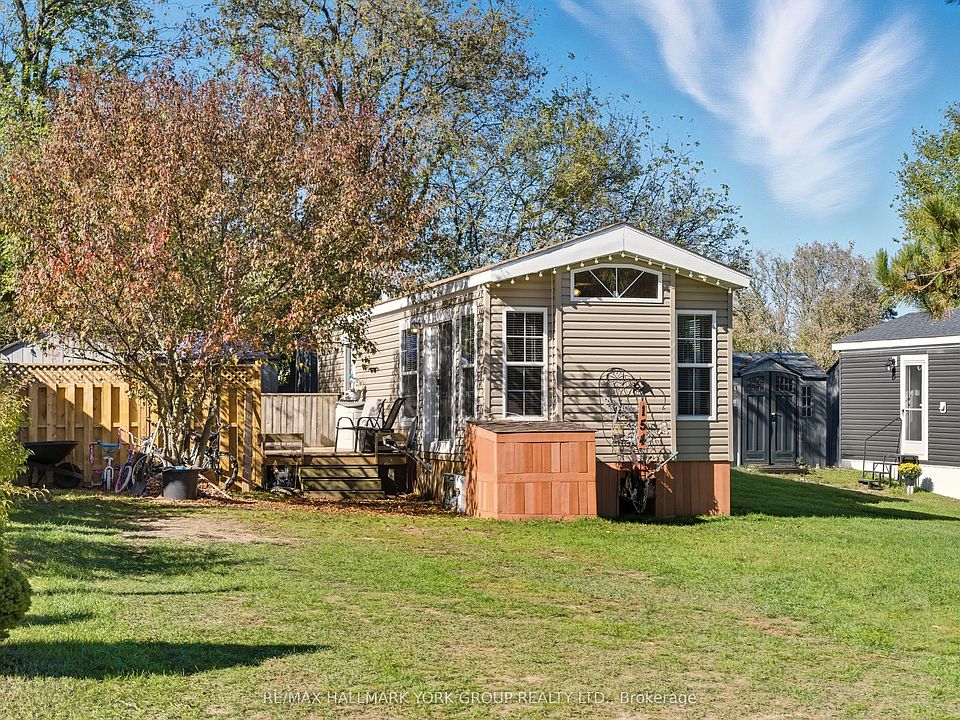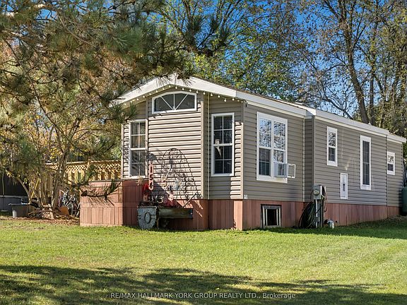York Regional Forest At Your Door! Step Into A Bright, Cozy 2 bed, 1 bath Home, Where Comfort Meets Convenience. The Warm Living Room With Electric Fireplace Is Perfect For Movie Nights, While The Eat In Kitchen Adds Flexible Space For Lounging Or Hosting. The Backyard Is Built To Host At Lot 154 With A Multizone Deck With A Custom Outdoor Bar For Stool Seating, Umbrella Lounge And Bbq Nook, All Framed By Mature Trees and Gardens. Love The Outdoors? Walk Straight To Forest Trails... Ideal For Nature Enthusiasts. Extras Include Two Handy Sheds To Store Gear And Toys, And There's Parking For 3. Move In Ready, Affordable, And Set In A Warm Community, This One's An Easy "Yes". Book Your Showing Today!