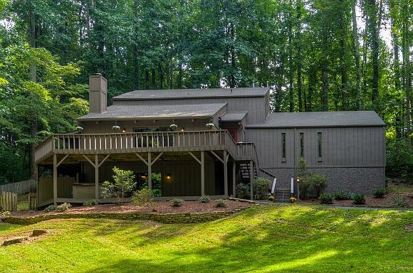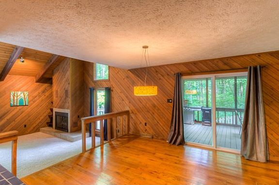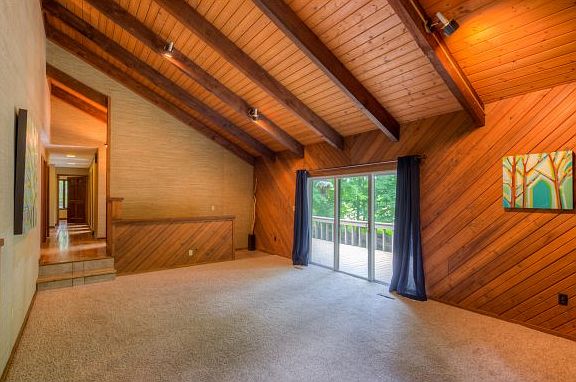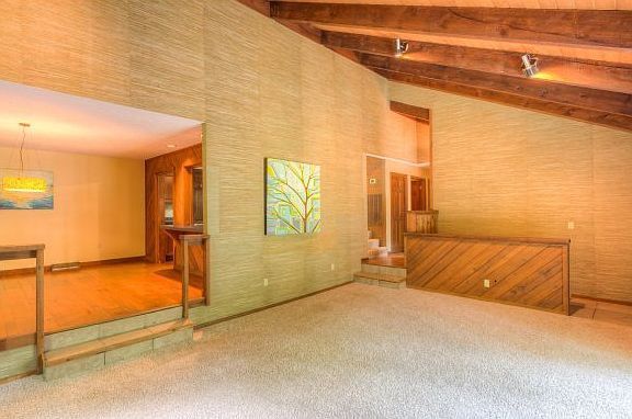 Spacious Rustic Contemporary Home nestled among the trees on a very private lot in Lowry Hills only minutes to shopping and restaurants. This 3 bedroom, 3 bath home has over 3000 sq ft of living area and a great open floor plan. The main level features a huge sunken living room with new carpet, vaulted tongue and groove/beam ceilings and a gas fireplace. Opening to a large dining area. The kitchen has tons of cabinet space, walk in pantry, and stainless appliances . The dining area leads to a l
