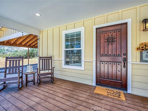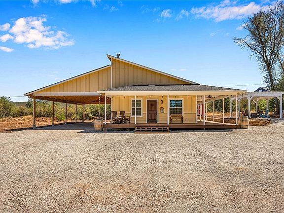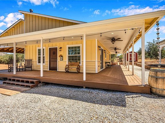 Welcome to your own peaceful retreat on 5.36 private acres, where modern farmhouse charm blends seamlessly with the comforts of contemporary living. Enter through the custom-built steel gate and follow the meandering driveway to a beautifully crafted 2-bedroom, 1-bath cottage that’s full of style and warmth. Inside, the open-concept great room greets you with soaring vaulted ceilings, luxury vinyl plank flooring, and an abundance of natural light. A cozy gas fireplace set on a raised slate hearth creates the perfect gathering space. The kitchen is a true standout—featuring custom live-edge wood countertops & open shelving milled from local Cobb Mountain lumber, stainless steel appliances, and a large farmhouse sink. The bathroom is equally impressive with a deep soaking tub/shower combo, floor-to-ceiling faux wood tile, and a custom vanity topped with a hammered copper sink basin. Both bedrooms are spacious, featuring recessed lighting, stylish ceiling fans, and oversized closets. A dedicated laundry room adds everyday convenience, and efficient mini-split systems keep the home comfortable year-round. Relax on the covered wrap-around porch with ceiling fans and lighting, or entertain under the nearby pergola seating area. The attached oversized carport offers flexibility—add a third bedroom, bonus living space, & garage if desired. Head up the driveway further to a second cleared building site with an existing septic system—ideal for a main and/or secondary home with panoramic views of the surrounding valley, mountains, and vineyards. An RV parking pad with septic hookup, freestanding bathroom/storage building, and multiple animal pens expand your options for living, working, or playing on the land. No HOA, endless potential, and priced to sell—this is a rare opportunity to enjoy peaceful country living with modern comforts already in place.